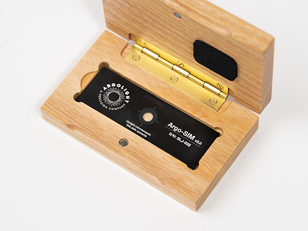 Argo-SIM for structured illumination and stochastic super-resolution methods / image reconstruction systems. The slides consist in a special glass piece (ArgoGlass) set on a stainless steel carrier. Different fluorescent patterns are embedded inside the glass.