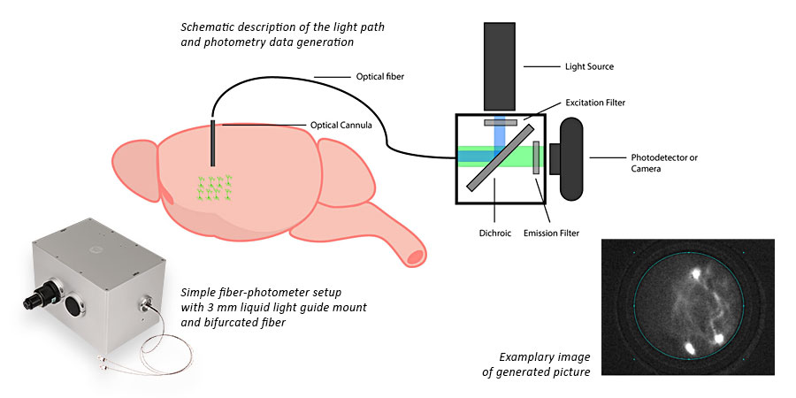 Das von der Messprobe rückemittierte Fluoreszenzsignal wird nach Durchlaufen eines klassischen Filterwürfels, direkt von der Kamera (oder alternativ von einem Photodetektor) erfasst und aufgezeichnet. Diese Konfiguration ermöglicht die Überwachung der Aktivität von Zellgruppen, einschließlich Calcium-Fluktuationen, Membran-Depolarisationen mithilfe spannungssensitiver Farbstoffe (VSDs), Neurotransmitter-Reporter oder anderer dynamischer Reporter und Farbstoffe durch eine Faser. Mit der PolyScan4-Software lassen sich Variationen in der Fluoreszenzintensität unkompliziert mit Verhaltensdaten oder systemischen Beobachtungen einfach über digitale Zeitstempel korrelieren und anschließend auswerten.
