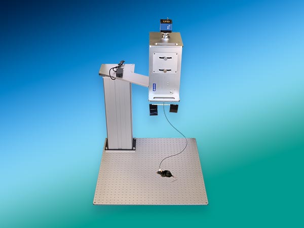 Ein optionales, robustes Montagegestell, wie links dargestellt, ermöglicht die Positionierung des OASIS-Basismoduls direkt über der Versuchsarena oder dem Homecage des Tieres, sodass das Tier normal agieren und sich ungehindert verhalten kann.